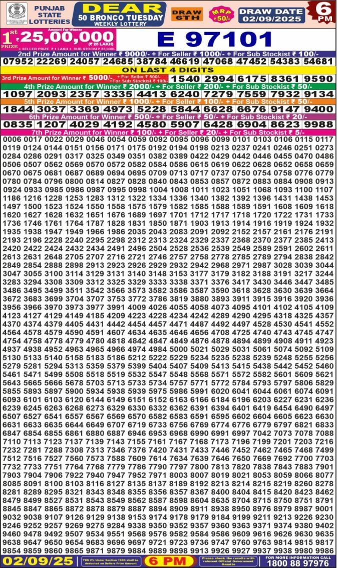 Punjab State Dear 50 6pm Lottery Result 02.09.2025