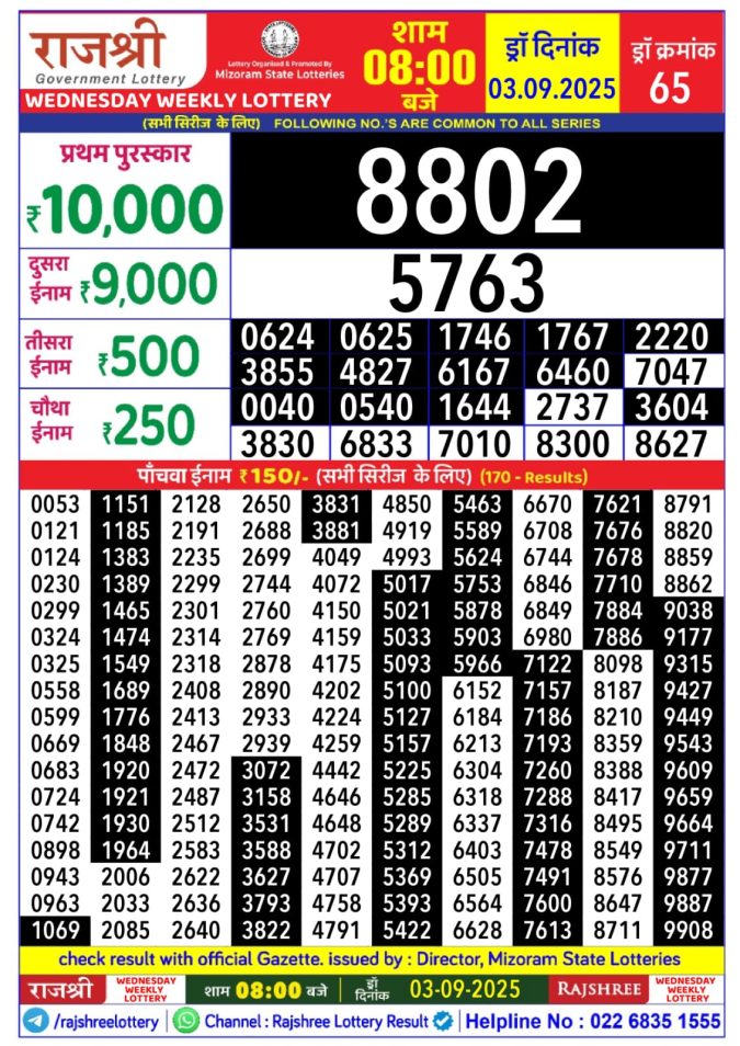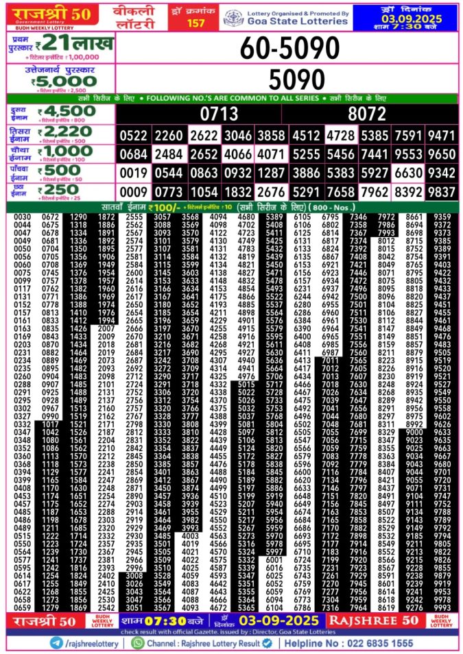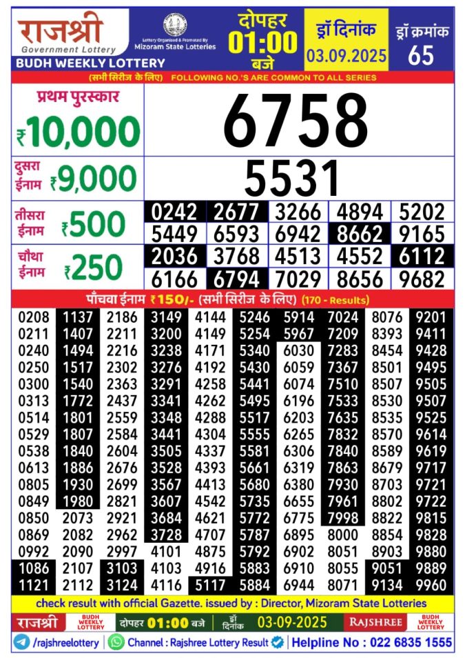 Rajshree Budh Weekly Lottery 1pm Result 03.09.2025