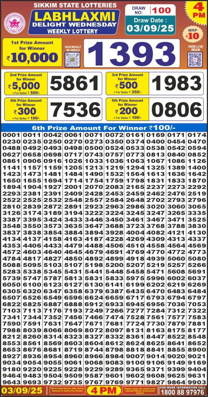 Golden 100 monthly lottery result 03.09.2025