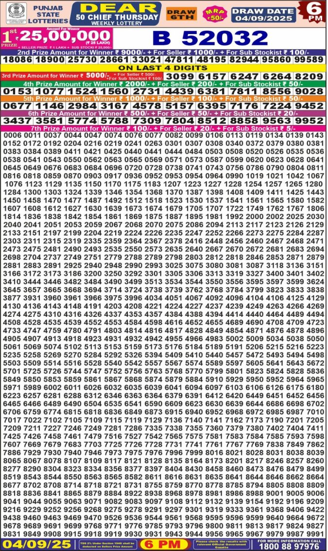 Punjab State Dear 50 6pm Lottery Result 04.09.2025