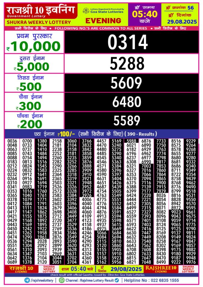 Rajshree 10 Evening Friday 5:40pm Result 29.08.2025