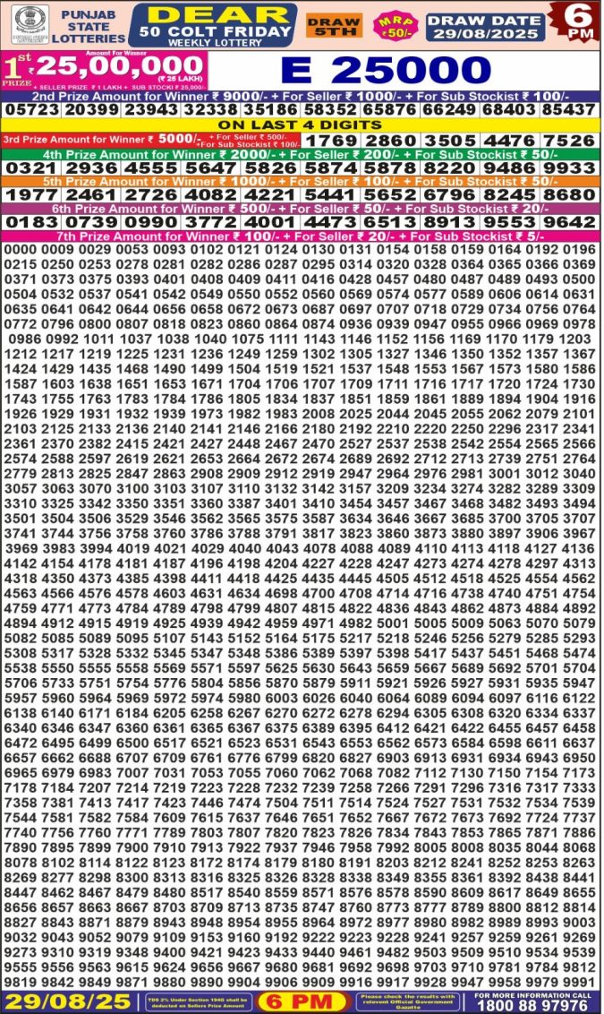 Punjab State Dear 50 6pm Lottery Result 29.08.2025