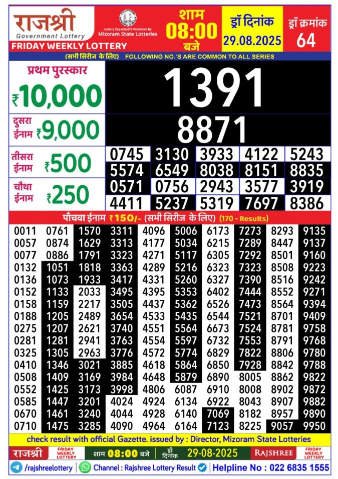 Rajshree Weekly Lottery 8pm Result 29.08.2025