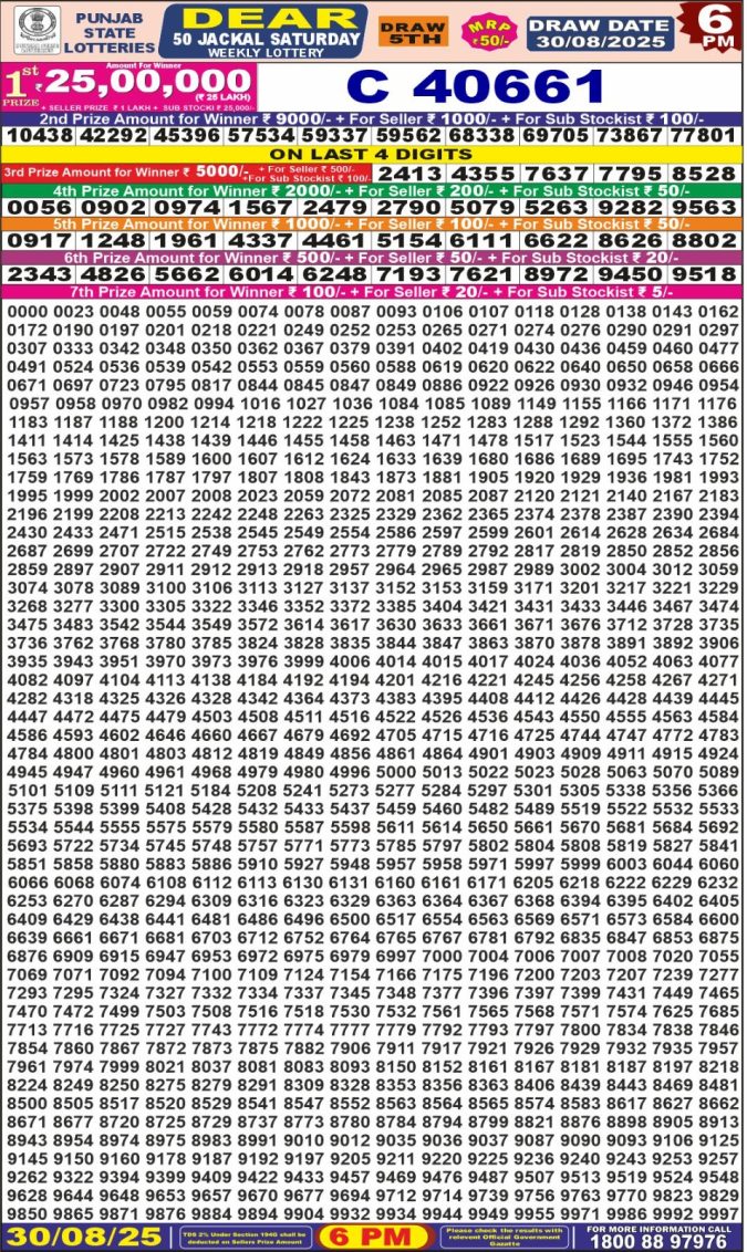 Punjab State Dear 50 6pm Lottery Result 30.08.2025