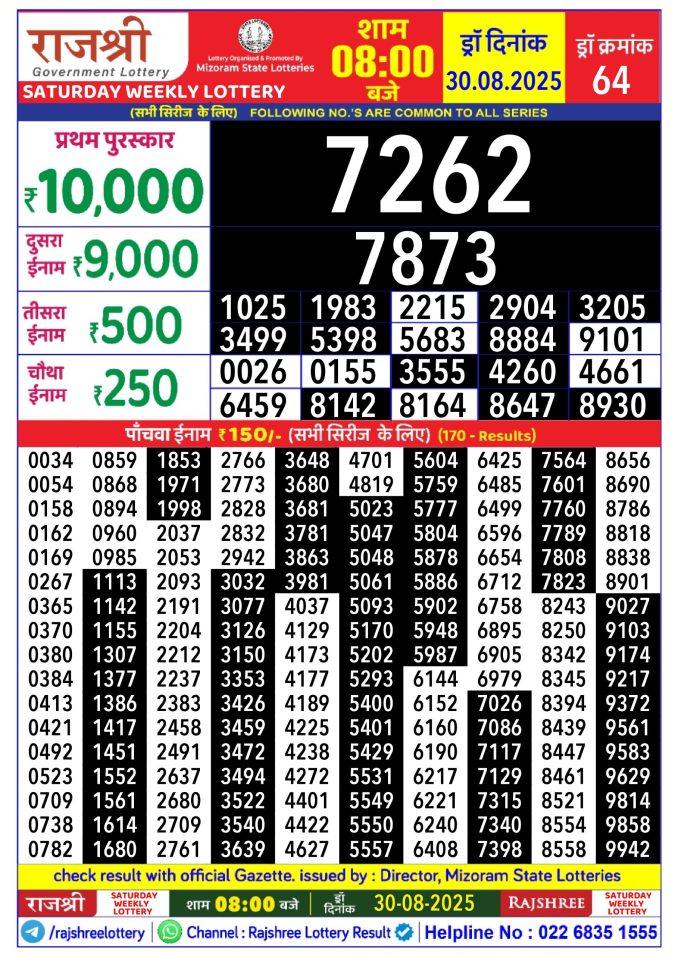 Rajshree Weekly Lottery 8pm Result 30.08.2025