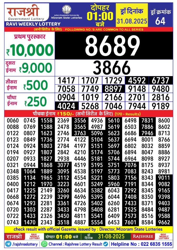 Rajshree Ravi Weekly Lottery 1pm Result 31.08.2025