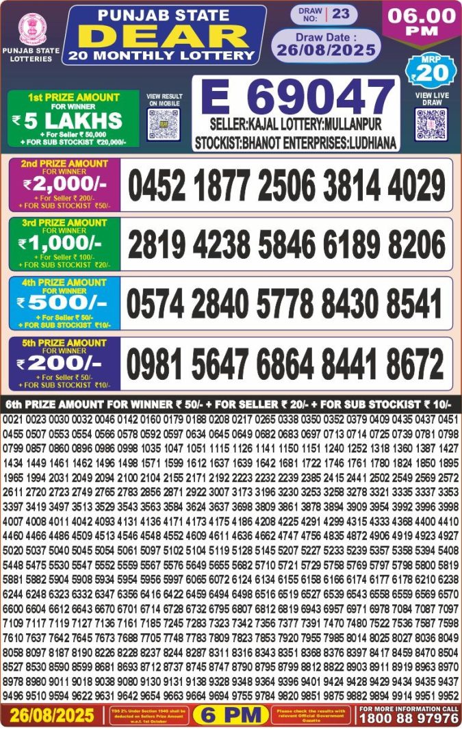 Punjab State Dear 20 Monthly Lottery Result 26.08.2025
