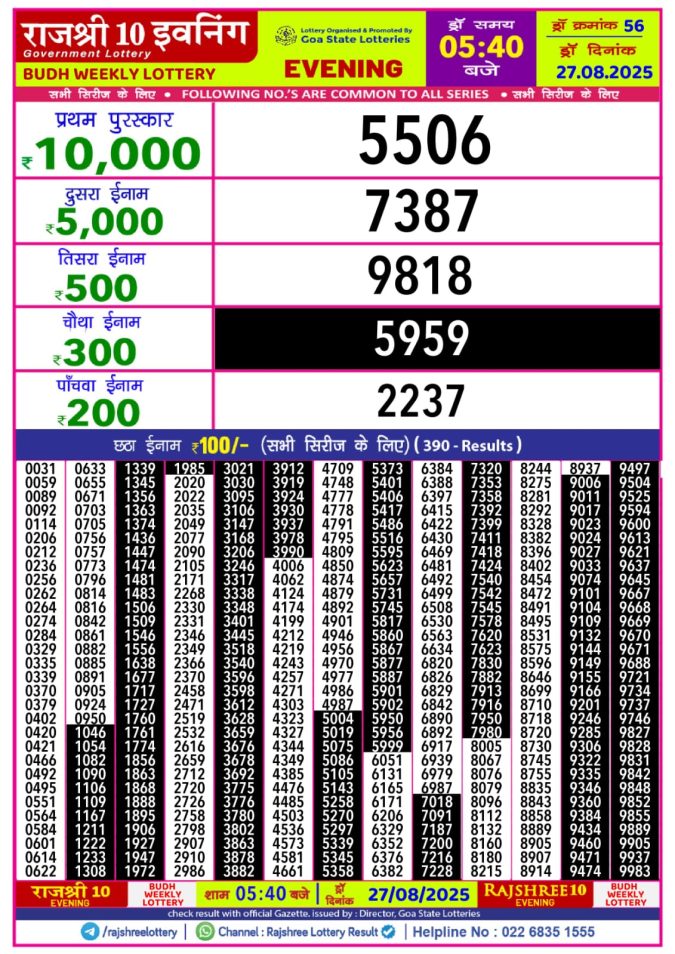 Rajshree 10 Evening Wednesday 5:40pm Lottery Result 27.08.2025