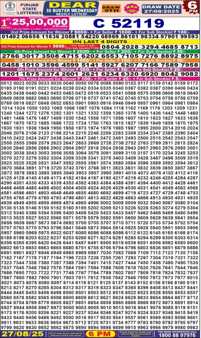 Punjab State Dear 50 6pm Lottery Result 27.08.2025
