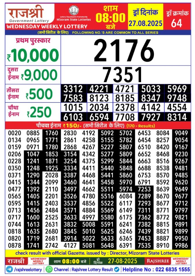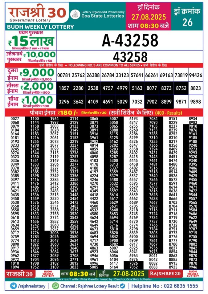 Rajshree Weekly Lottery 8pm Result 27.08.2025