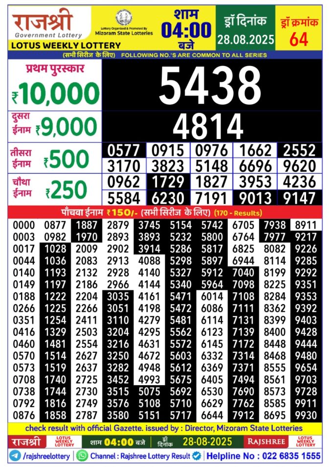 Rajshree Lotus Weekly Lottery 4pm Result 28.08.2025