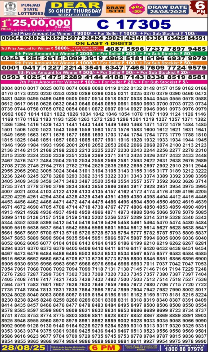 Punjab State Dear 50 6pm Lottery Result 28.08.2025