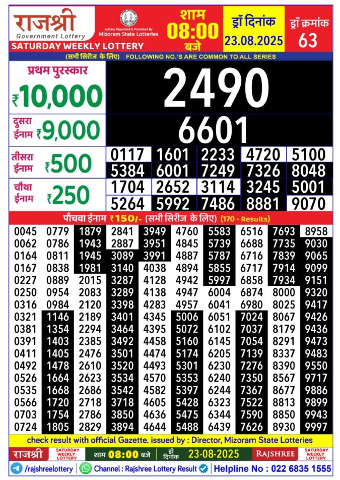 Rajshree Weekly Lottery 8pm Result 23.08.2025