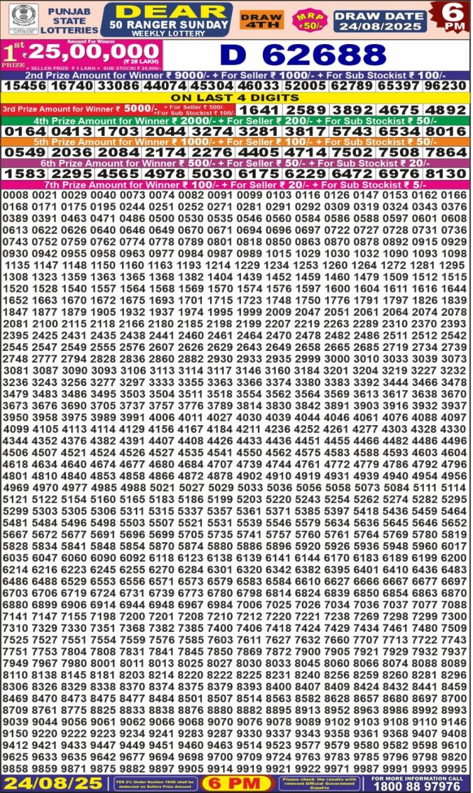 Punjab State Dear 50 6pm Lottery Result 24.08.2025