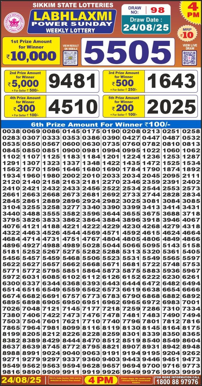 Rajshree Sunflower Sunday Weekly Lottery 4pm Result 24.08.2025