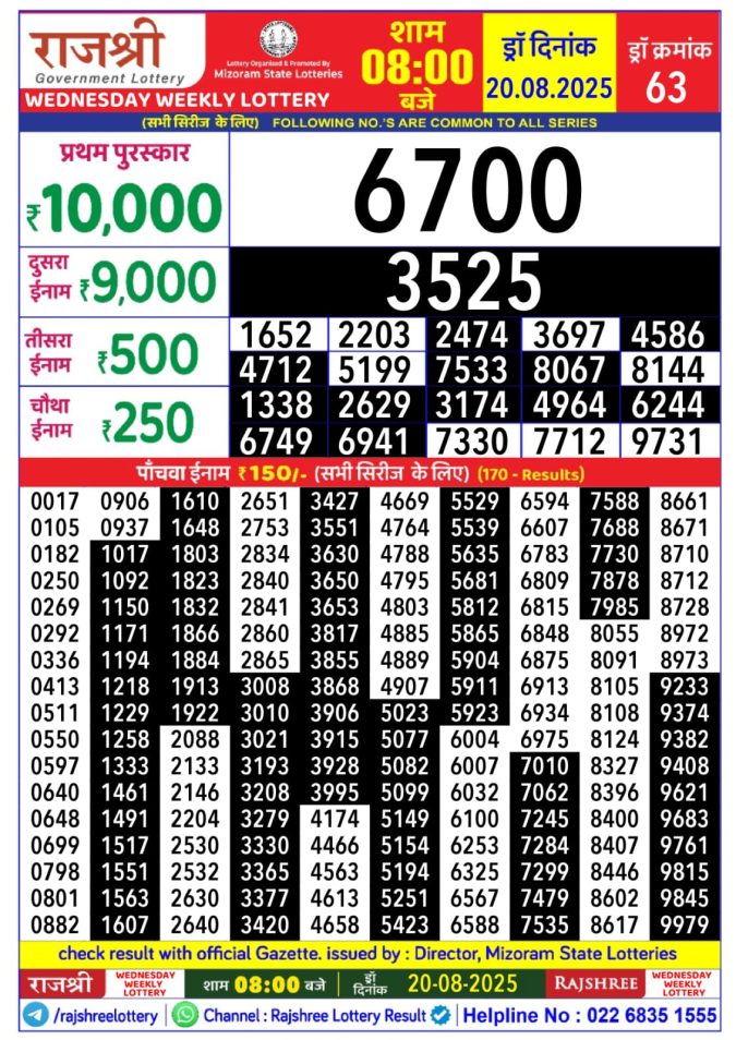 Rajshree Weekly Lottery 8pm Result 20.08.2025