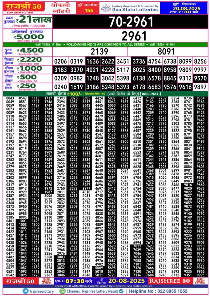 Rajshree 50 Lottery 7:30pm Result 20.08.2025
