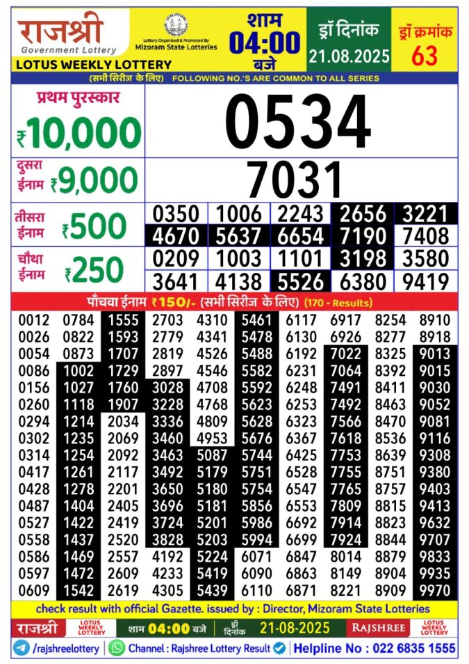 Rajshree Lotus Weekly Lottery 4pm Result 21.08.2025