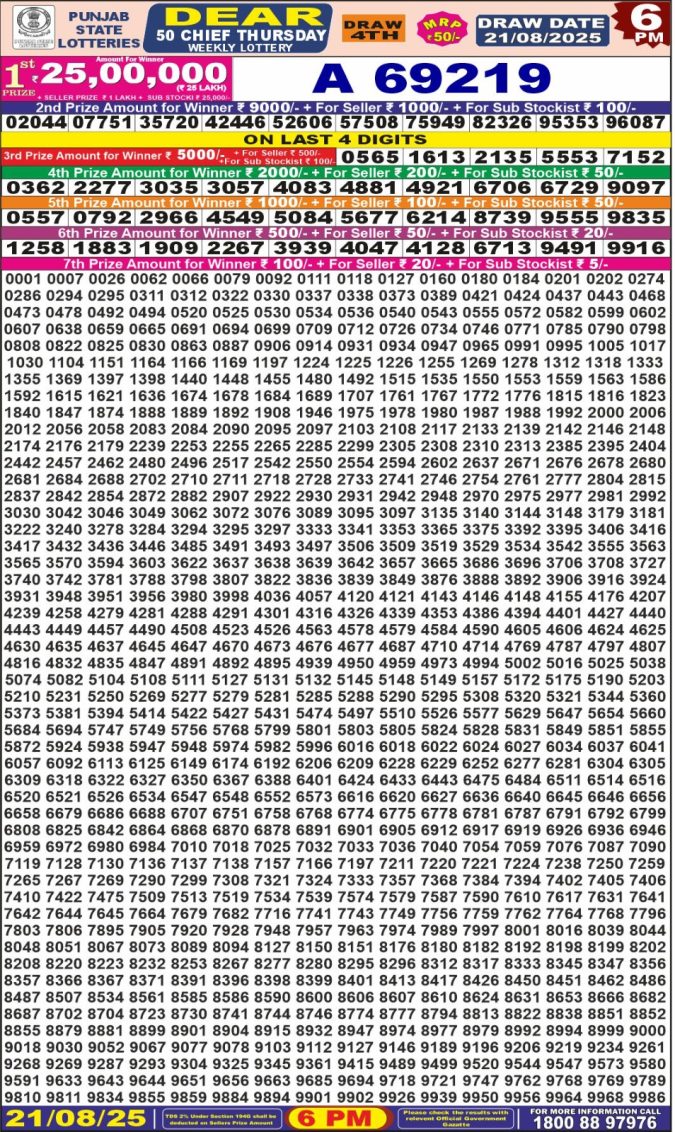 Punjab State Dear 50 6pm Lottery Result 21.08.2025