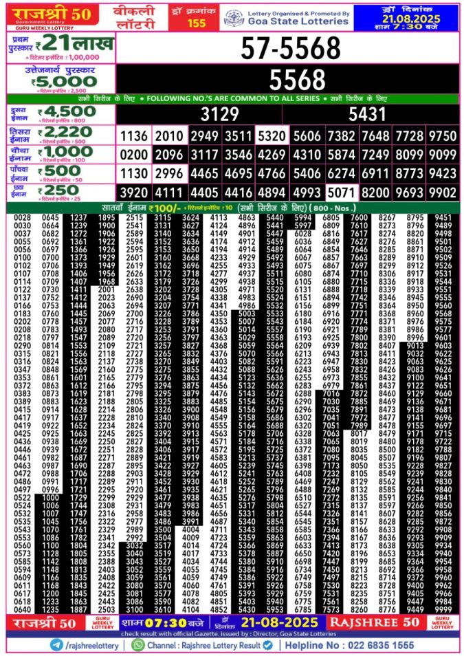 Rajshree Guru Weekly Lottery 1pm Result 21.08.2025