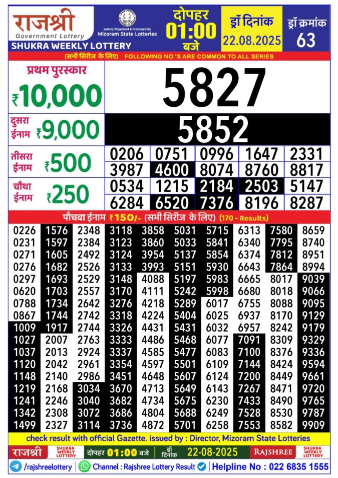 Rajshree Shukra Weekly Lottery 1pm Result 22.08.2025