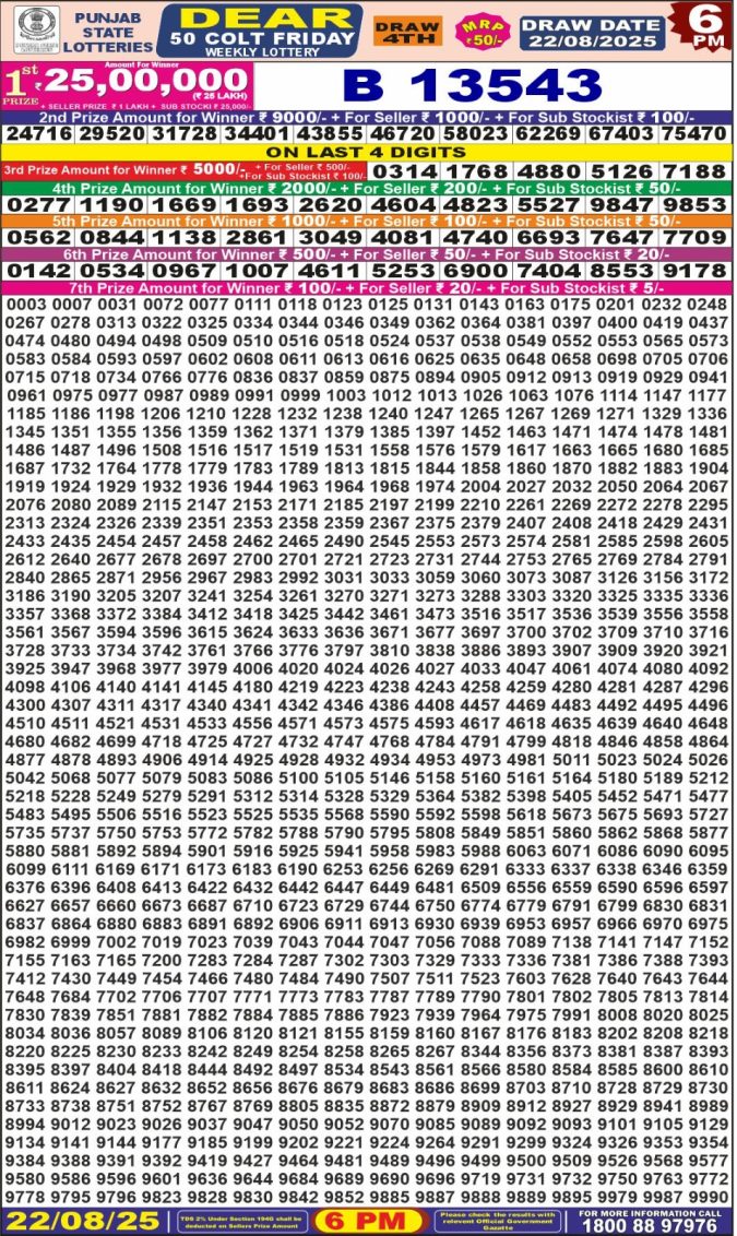 Punjab State Dear 50 6pm Lottery Result 22.08.2025