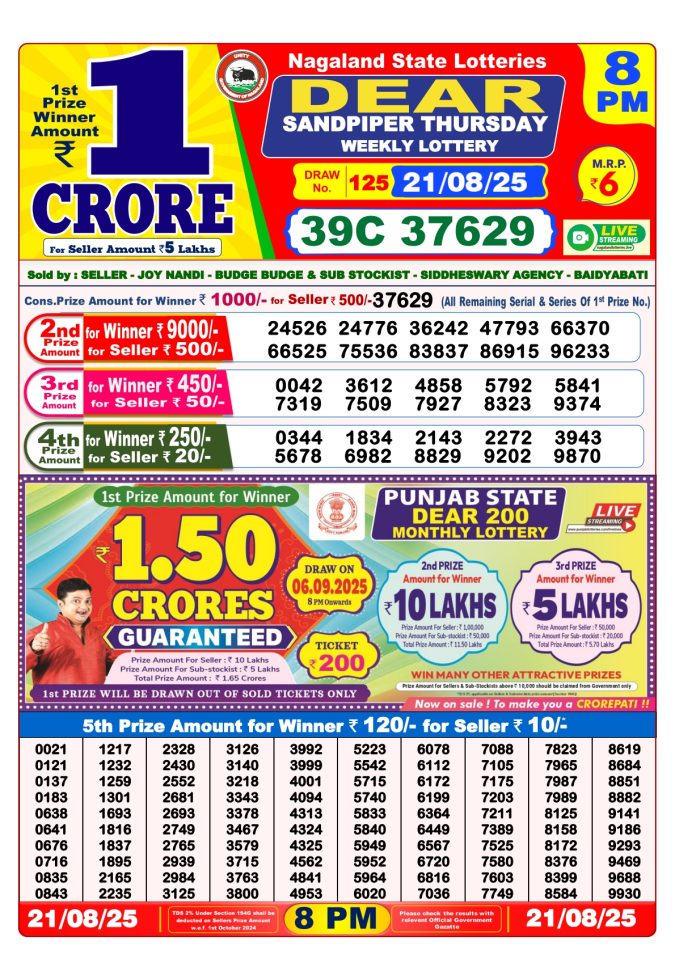 Dear Sandpiper Thursday Weekly Lottery 8pm Result 21.08.2025