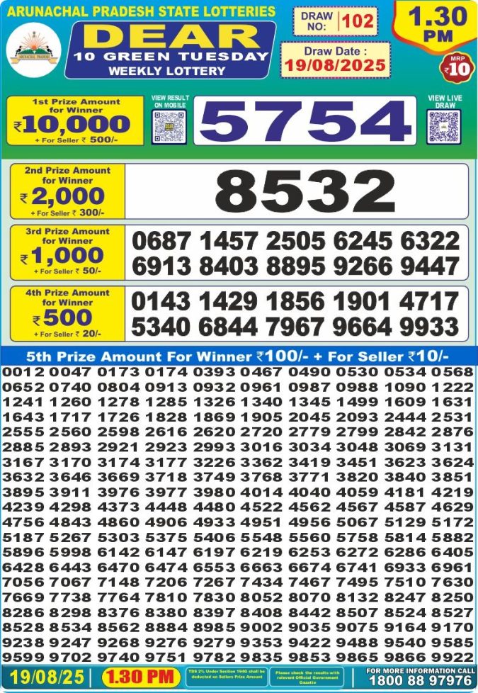 Dear 10 Green Lottery 1.30pm Result 19.08.2025