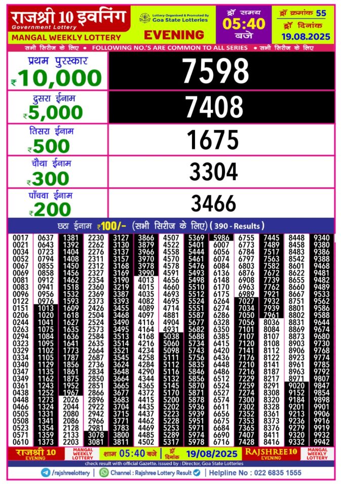 Rajshree 10 Evening Tuesday 5:40pm Result 19.08.2025
