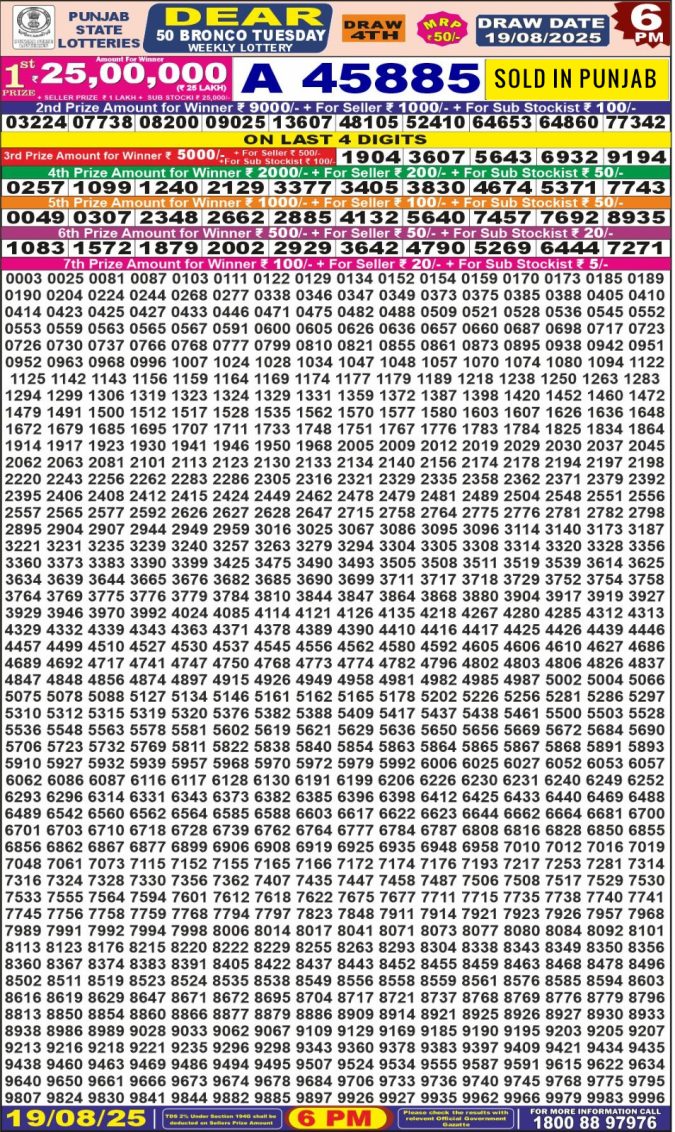 Punjab State Dear 50 6pm Lottery Result 19.08.2025