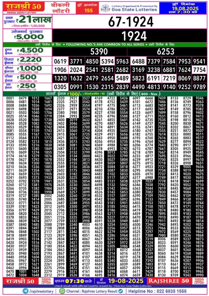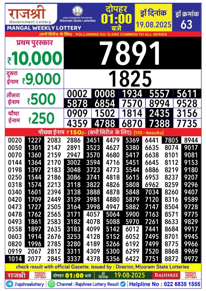 Rajshree Mangal Weekly Lottery 1pm Result 19.08.2025