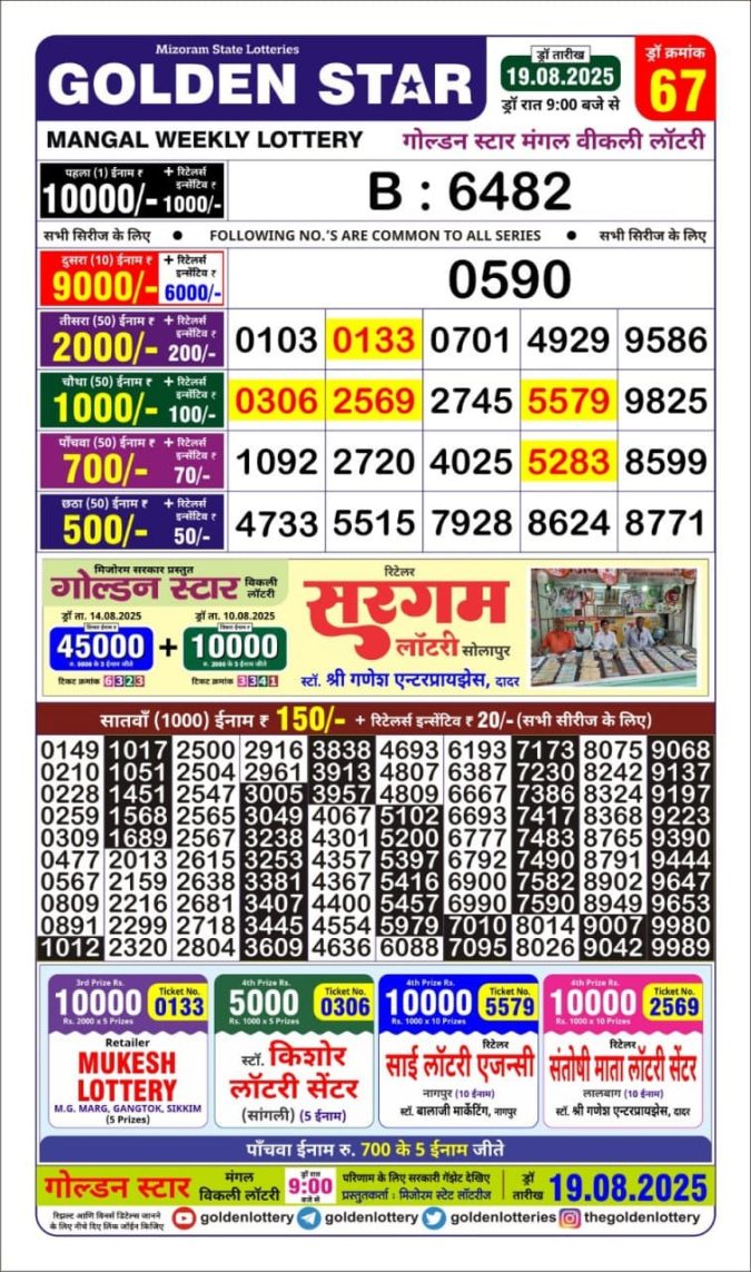 Golden Star Weekly Lottery Result 9pm 19.08.2025