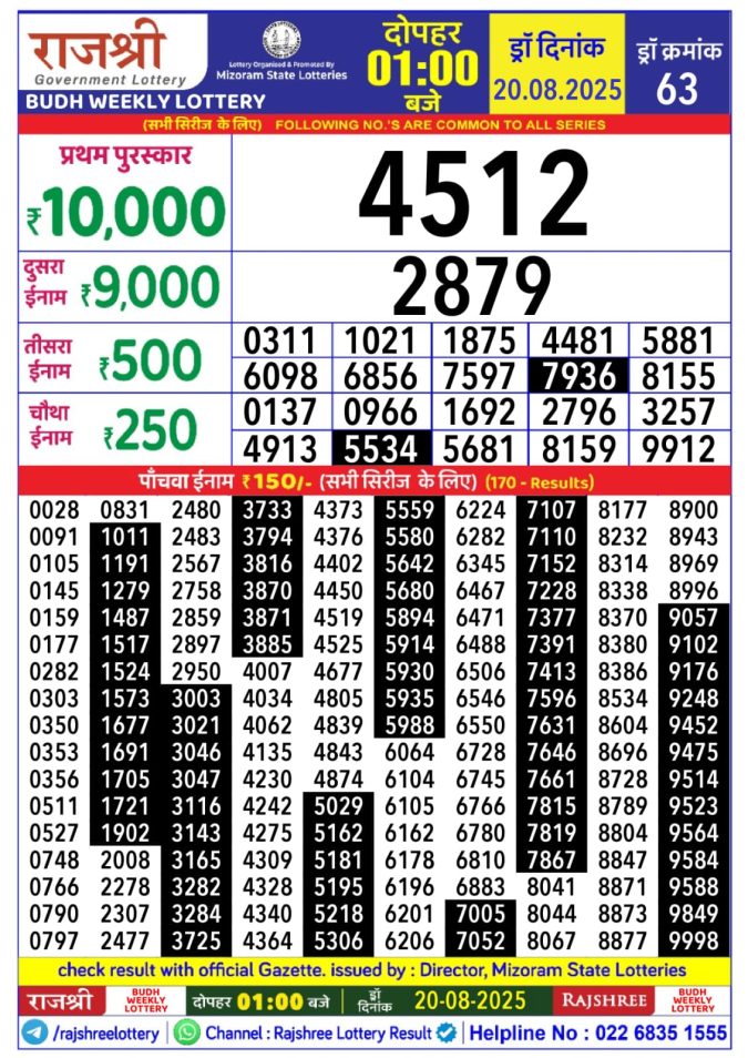 Rajshree Budh Weekly Lottery 1pm Result 20.08.2025