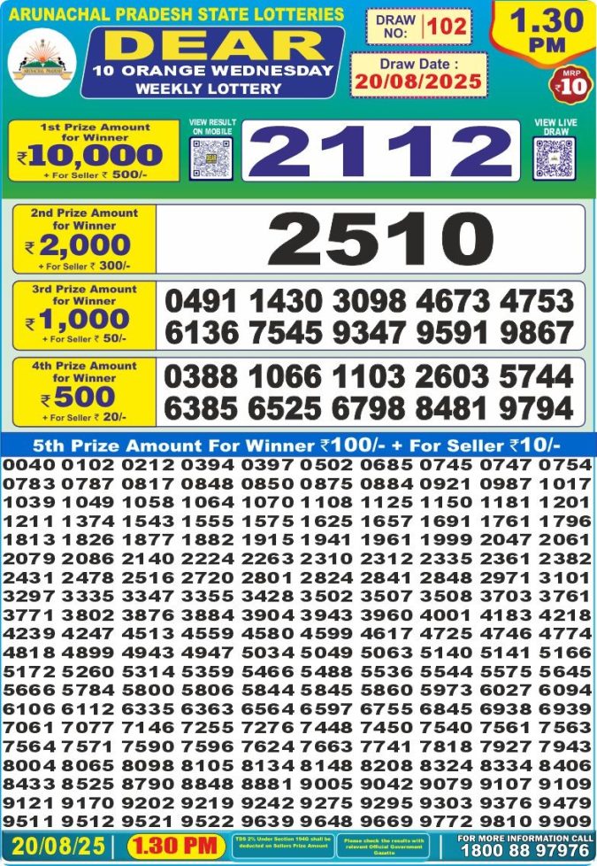 Dear 10 Orange Lottery 1.30pm Result 20.08.2025