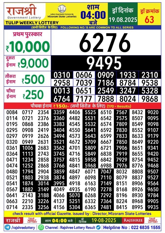 Rajshree Tulip Tuesday Weekly Lottery 4pm Result 19.08.2025
