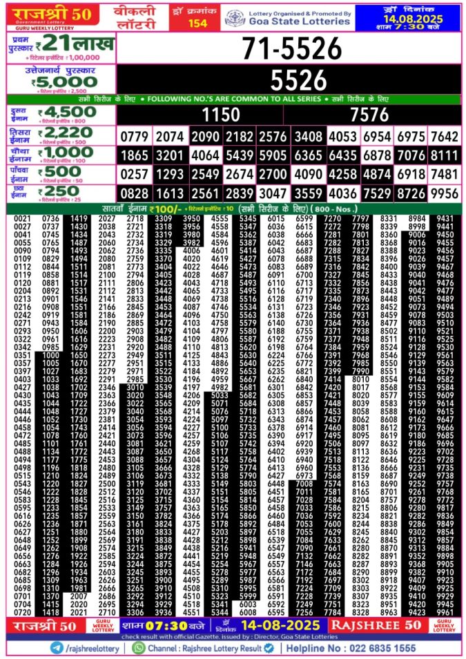 Rajshree 50 Lottery 7:30pm Result 14.08.2025