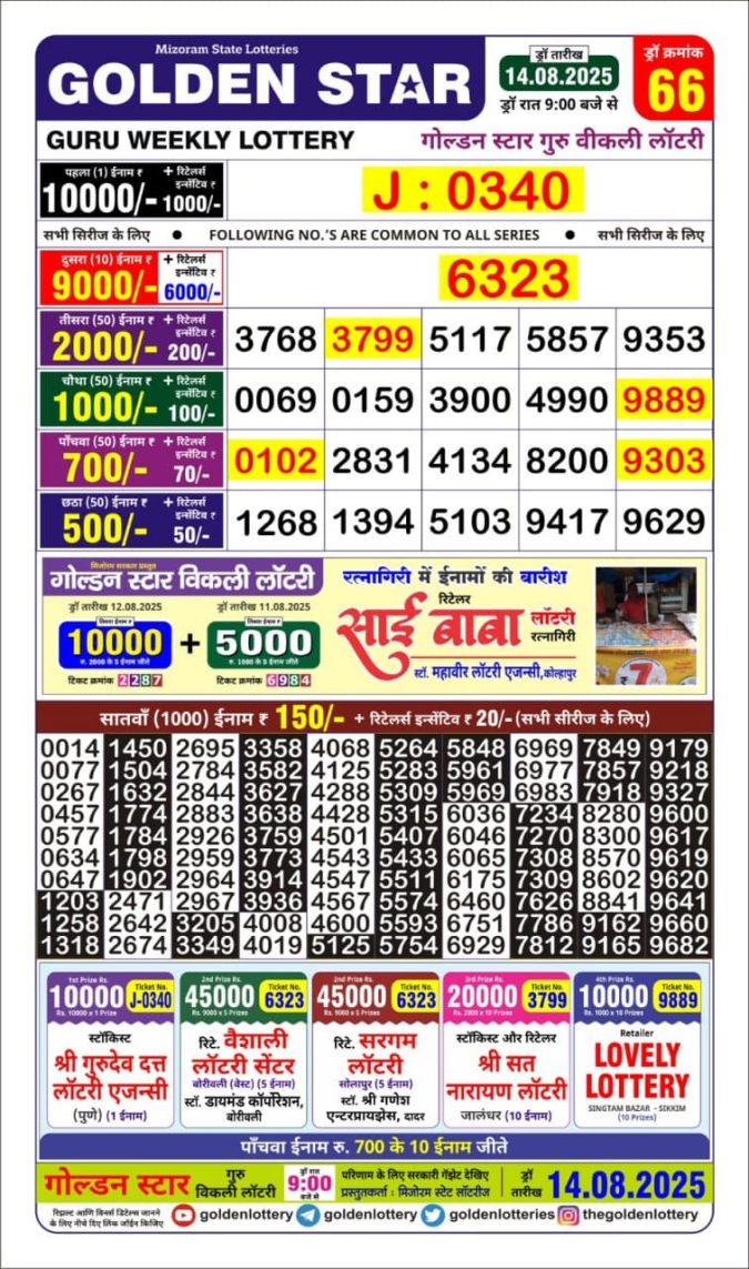 Golden Star Weekly Lottery Result 9pm 14.08.2025