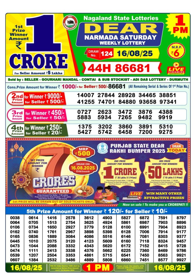 Dear Narmada Saturday Weekly 1pm Result 16.08.2025