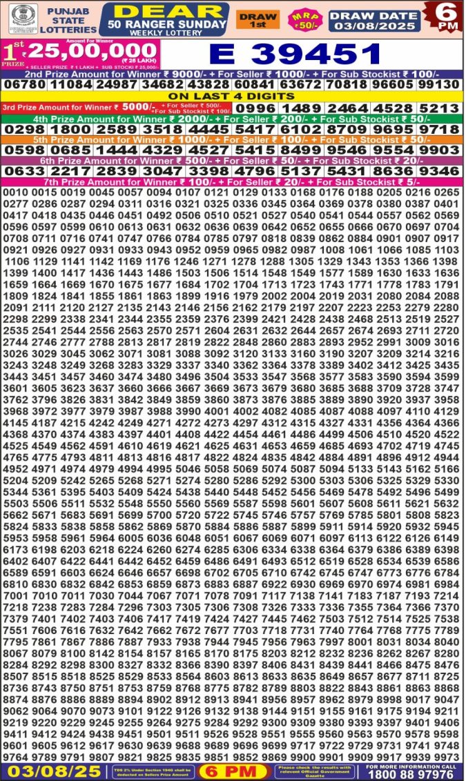 Punjab State Dear 50 6pm Lottery Result 03.08.2025