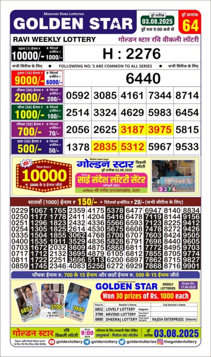 Golden Star Weekly Lottery Result 9pm 03.08.2025