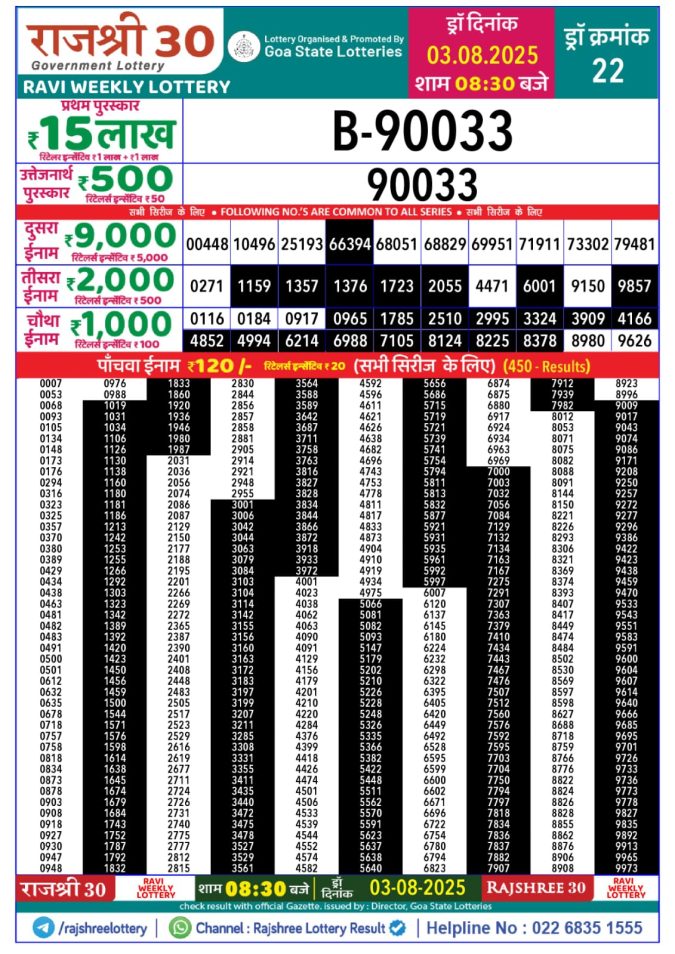 Rajshree Weekly Lottery 8pm Result 03.08.2025