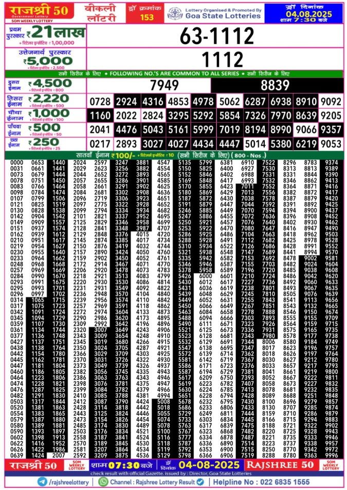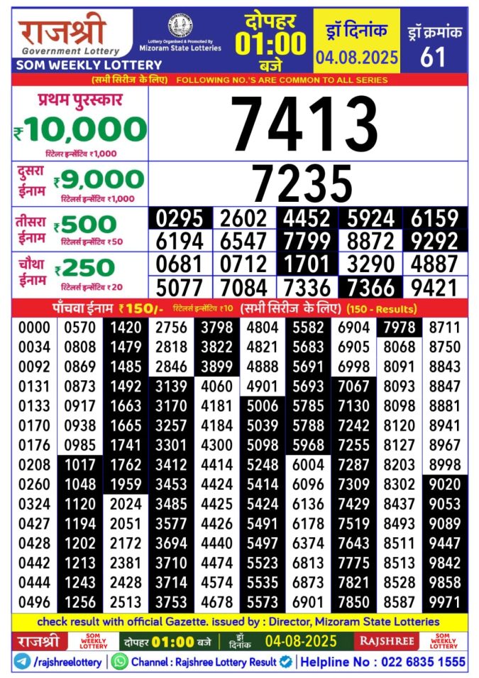 Rajshree Som Weekly Lottery 1pm Result 04.08.2025