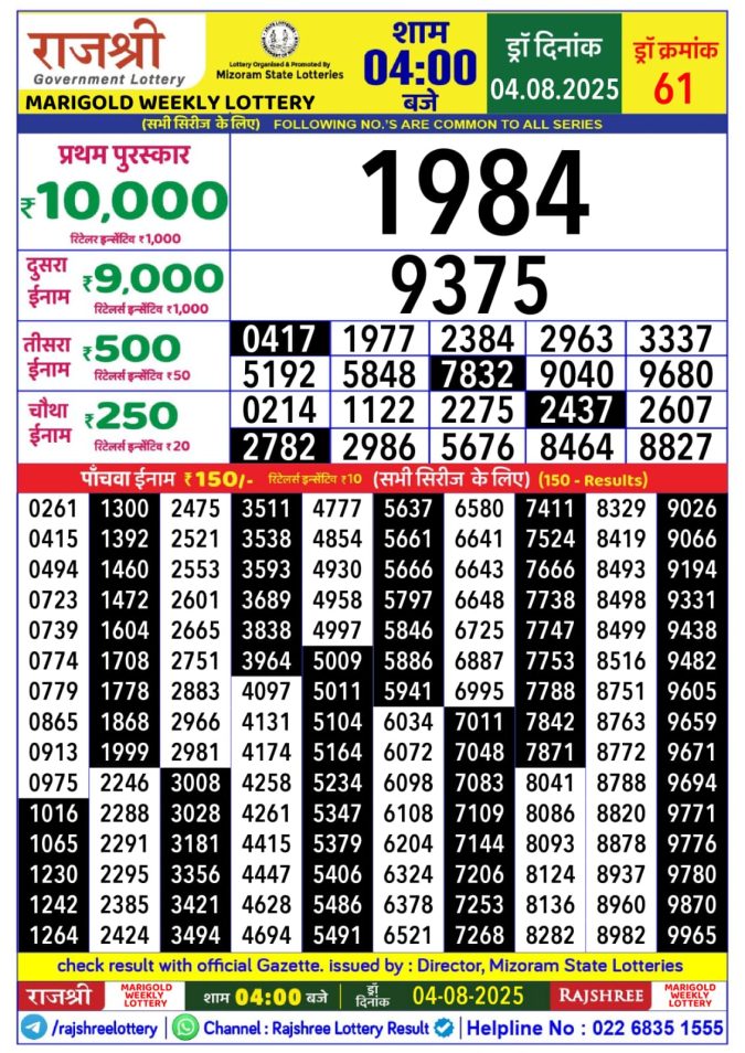 Rajshree Marigold Monday Weekly Lottery 4pm Result 04.08.2025