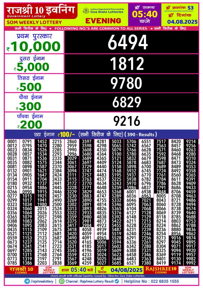Rajshree 10 Evening Monday 5:40pm Result 04.08.2025