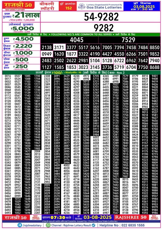 Rajshree 50 Lottery 7:30pm Result 03.08.2025