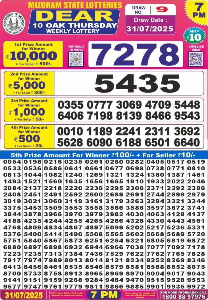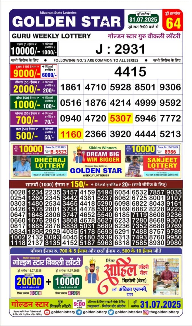 Golden Star Weekly Lottery Result 9pm 31.07.2025