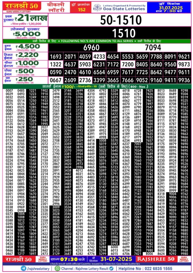 Rajshree 50 Lottery 7:30pm Result 31.07.2025
