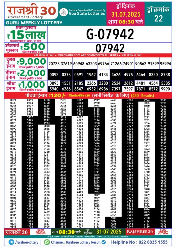 Rajshree Guru Weekly Lottery 1pm Result 31.07.2025