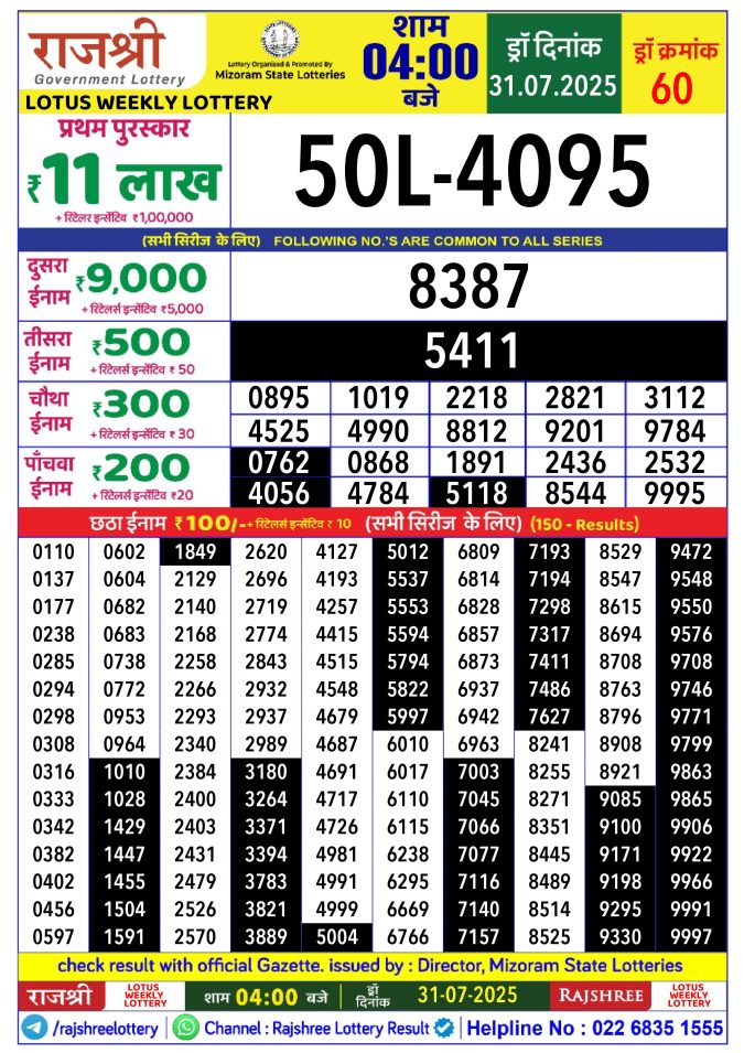 Rajshree Lotus Weekly Lottery 4pm Result 31.07.2025
