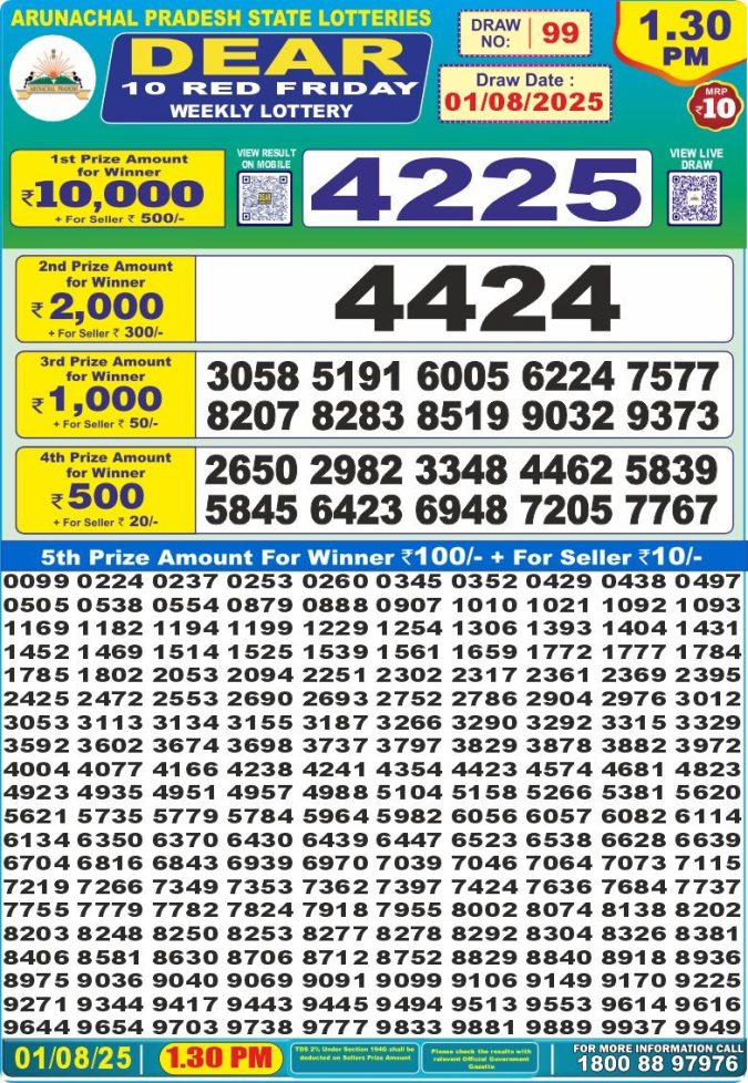 Dear 10 Red Lottery 1.30pm Result 01.08.2025